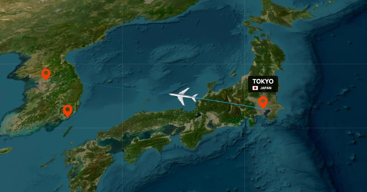 Horizontal flight route animation from Tokyo to Seoul by plane, continuing to Busan by car.